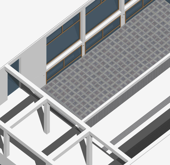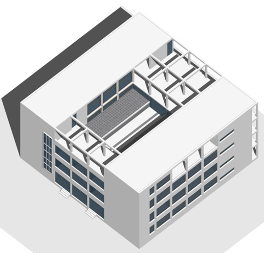 Le immagini di questa pagina sono direttamente derivate dal nostro disegno dwg 3D. Il modello ha le ripartizioni interne, solai, scale, tramezzi. Il 3D è in modellazione solida, si possono quindi fare anche spaccati assonometrici e prospettici. Click per l'anteprima cad e di dettaglio.